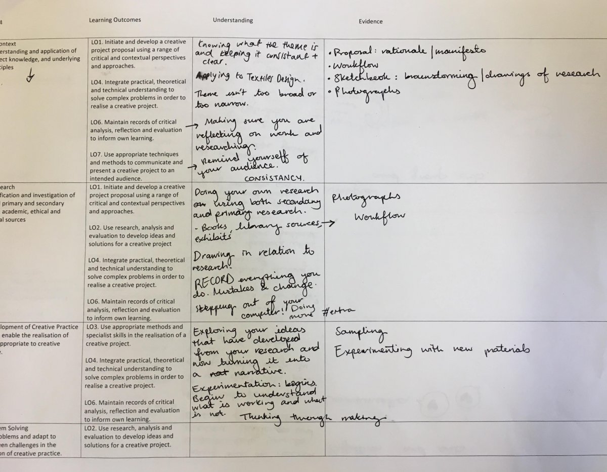 At the studio using a guidance sheet to improve my reflection and research for my final major project. I noticed areas where I need to add, for example more writing surrounding the images I chose and need to a review a gallery visit. I clarified the need for improvement with a partner who I showed my workflow to and he showed his for inspiration and to help each other to find areas of improvement. I will make these changes and use this improvement throughout the project.
